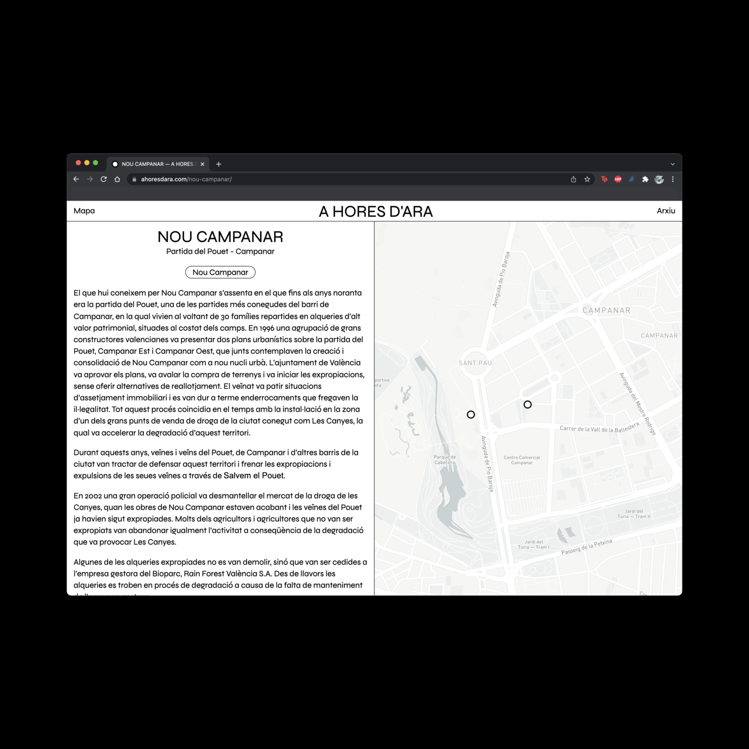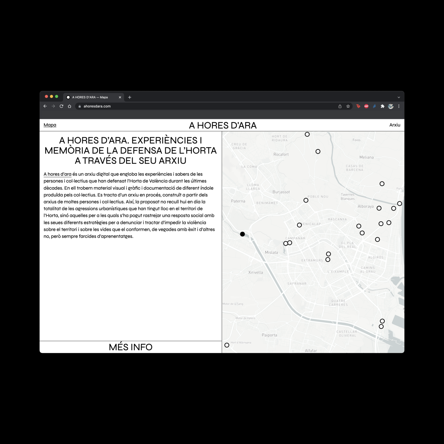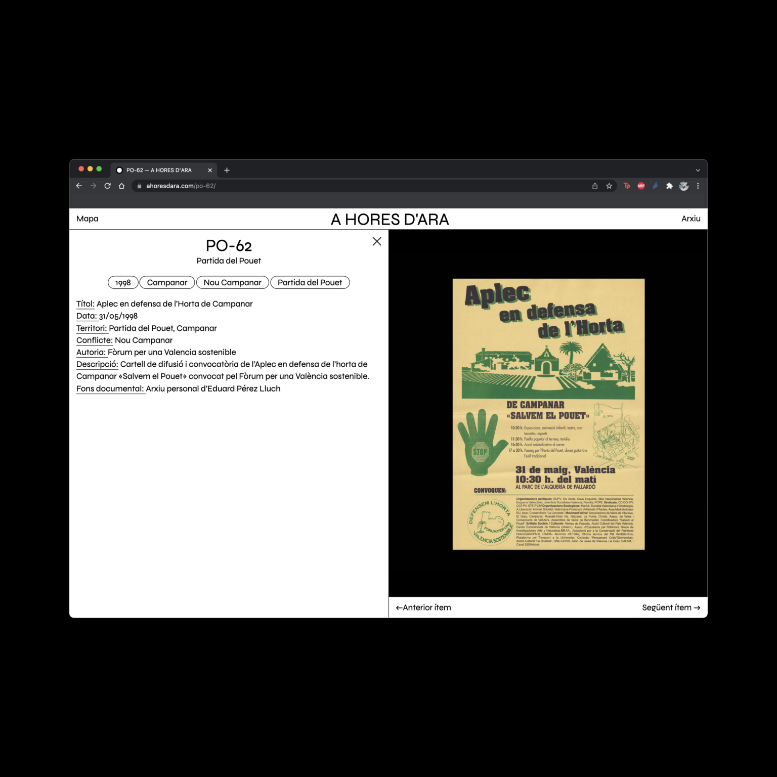 El archivo se materializa en una plataforma web que permite compartir y visibilizar los archivos digitalizados a lo largo del proyecto. Se trata de un archivo en proceso, en el cual se ha puesto el foco fundamentalmente en los procesos de lucha y defensa del territorio. Así, el archivo propuesto no recoge hoy en día la totalidad de las agresiones urbanísticas que han tenido lugar en el territorio de l’Horta, sino aquellas para las cuales se ha podido rastrear una respuesta social con sus diferentes estrategias para denunciar y tratar de impedir la violencia sobre el territorio y sobre las vidas que lo conformen, a veces con éxito y en otros no, pero siempre plagadas de aprendizajes: www.ahoresdara.com