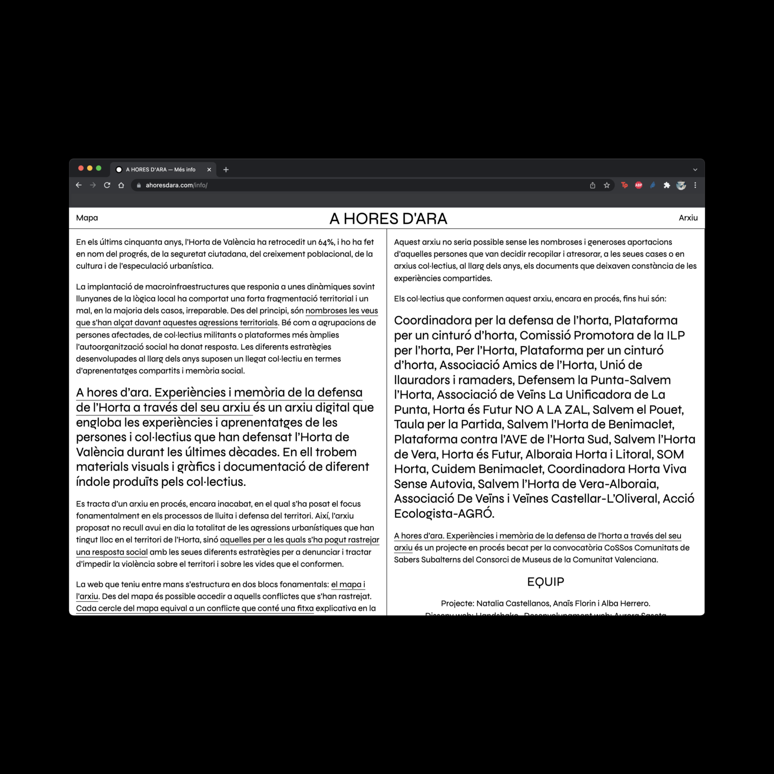 A hores d’ara. Experiències i memòria de la defensa de l’horta a través del seu arxiu. es un proyecto planteado para el largo plazo que pretende poco a poco poder ir incorporando nuevos materiales, conflictos y testimonios que aún no están presentes en la página web.